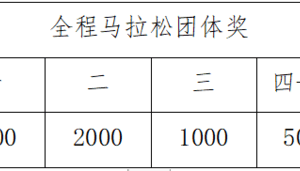 全程马拉松设置团体奖。团体报名的选手(≥5人,其中女性至少1人),赛前对符合要求的团队进行公示,赛后取最好的4位男子和1位女子的净成绩进行累加排名,给予对应奖励。如果男子不足4位的部分用女子成绩,女子至少贡献一个有效成绩。所有符合条件的队伍取前二十名,分别予以奖励。